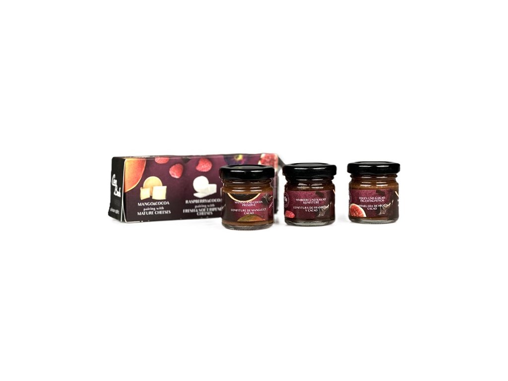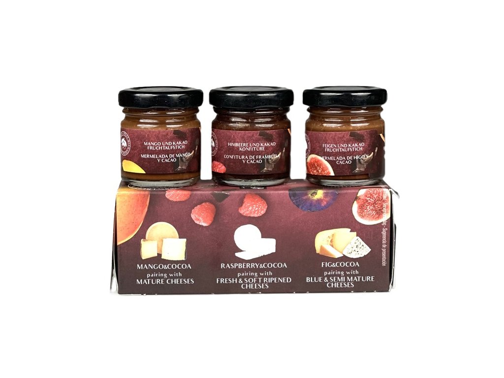 3 variace confitur je 100 % přírodní a speciálně vytvořené pro charakteristické párování chutí s každým druhem sýrů. Mangový se nejlépe hodí k uleželým, vyzralým sýrům. Malinový k jemným čerstvým sýrům jako je kozí či ovčí nebo feta.. Fíkový k plísňovým sýrům či mladým ementálům a goudám. Přidejte k čerstvému sýru, ke smetanové zmrzlině nebo k jogurtu. Také se vhodně doplňuje s Foie Gras nebo čokoládovým dortem.