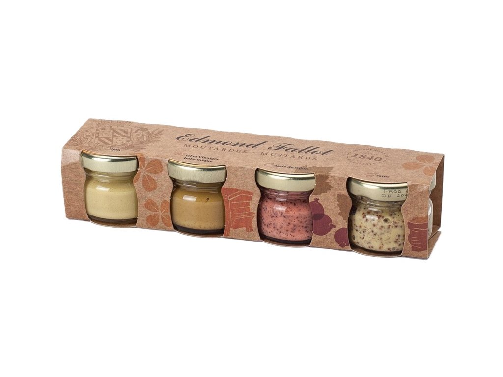 Burgundsko je zemí vinic a její vápencový terén s hustými lesy, z nichž se kdysi získávalo dřevěné uhlí, je bohatý na potaš, je tedy ideálním pro pěstování obzvláště silných a štiplavých hořčičných semen. Burgundská hořčice je vyrobená z osiva pěstovaného v Burgundsku a v kombinaci s burgundským vínem je skutečnou francouzskou tradicí. Výroba francouzské hořčice Edmond Fallot sahá až do roku 1840, kdy zakladatel této značky založil první mlýn na hořčici a oleje. Postupem času, v roce 1903 byl kvalitě jeho výrobků udělen diplom města Paříž, během Velké mezinárodní výstavy. Jeho dědici, dychtiví uchovat si tuto proslulost, pokračují v jeho stopách a věnují maximální pozornost kvalitě svých produktů a dbají na to, aby i nadále spojovali tradici s inovacemi. Nabízejí tak spotřebitelům produkt, který má zaručené vlastnosti i původ. Hořčice Edmond Fallot používají špičkoví kuchaři po celém světě. ------------------------------------------------------------------------------------------------------- Tak jako skvělý kuchař rád kombinuje různé příchutě, tak i vyváženosti a jemnosti hořčic Edmond Fallot je dosaženo použitím autentických surovin vysoké kvality z nejlepších zdrojů. Hořčice Edmond Fallot nabízejí širokou škálu pikantních příchutí, které okoření nejrůznější omáčky a předkrmy, připravené za okamžik. Vychutnejte si hořčice Edmond Fallot v kombinaci s bílým vínem, zeleným pepřem, vlašskými ořechy, provensálským kořením, estragonem, perníkem a medem, nebo bazalkou. Na talíři nebo v omáčkách jsou tyto hořčice velmi atraktivní a chutné. Tato degustační sada obsahuje 4x 25g skleničky. Klasickou krémovou dijonskou hořčici, která je ideální jako doplněk k rybám a masu, nebo ke zjemnění vinaigretových omáček nebo dipů. Hrubozrnnou dijonskou hořčici se zeleným pepřem, která se hodí do marinád a na smažená jídla, nebo jako doplněk k pečenému jehněčímu, nebo grilovanému masu. Dále je zde perníková hořčice s medem, která má pikantní a kořeněnou vůni a chutná velmi dobře s bílým masem, nebo jitrnicemi. Čtveřici dotváří hrubozrnná dijonská hořčice s rybízem s ovocnou, horkou chutí. Je vynikající pro vinaigrety a pokrmy ze zvěřiny.