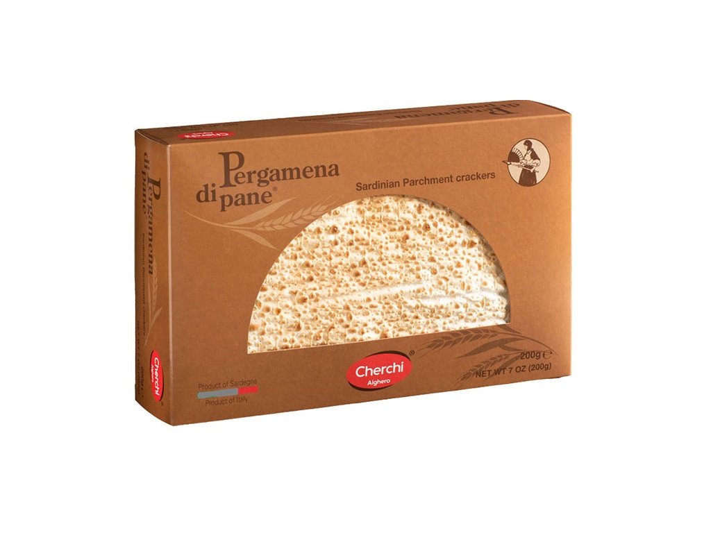 Pergamena di Pane jsou extra tenké, zlatavé a neuvěřitelně křupavé placky pocházející ze slunné Sardinie. Vznikají jen ze čtyř jednoduchých ingrediencí – semoliny z tvrdé pšenice, vody, droždí a soli –, díky čemuž vynikají čistou chutí a vysokou kvalitou. Jejich jemná slanost a lehká struktura dokonale podtrhnou jakékoli chutě. Skvěle se hodí k sýrům, uzeninám, rybám i masu, ale také k džemům, pomazánkám nebo čokoládovým krémům. Ač vypadají jednoduše, jejich výroba je poctivým procesem, který spojuje moderní technologie s tradičními sardinskými postupy. Výsledkem jsou křehké placky, jemnější a tenčí než klasický pane carasau – ideální jako lahodná svačina nebo elegantní doplněk ke studeným předkrmům.Složení: mletá semolina z durum PŠENICE, sůl, pivovarské kvasnice.
