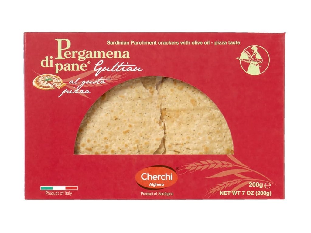 Pergamena di Pane jsou extra tenké, zlatavé a neuvěřitelně křupavé placky pocházející ze slunné Sardinie. Vznikají jen ze čtyř jednoduchých ingrediencí – semoliny z tvrdé pšenice, vody, droždí a soli –, díky čemuž vynikají čistou chutí a vysokou kvalitou. Jejich jemná slanost a lehká struktura dokonale podtrhnou jakékoli chutě. Skvěle se hodí k sýrům, uzeninám, rybám i masu, ale také k džemům, pomazánkám nebo čokoládovým krémům. Ač vypadají jednoduše, jejich výroba je poctivým procesem, který spojuje moderní technologie s tradičními sardinskými postupy. Výsledkem jsou křehké placky, jemnější a tenčí než klasický pane carasau – ideální jako lahodná svačina nebo elegantní doplněk ke studeným předkrmům.Složení: mletá semolina z durum PŠENICE, olivový olej, přírodní příchuť pizzy 3% (strouhanka - obsahuje lepek, rajče, sůl, oregano, přírodní aromata), sůl, pivovarské kvasnice, oregano.